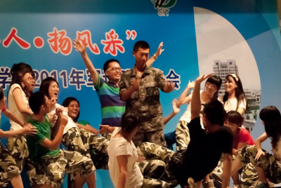 8月21日晚上,“学军人? 扬风采”军训联欢晚会在我校奉贤校区操场热烈举行。校党委副书记、副院长、军训领导工作小组组长康年,军训团团长唐兵应邀观看演出并为表演官兵颁奖。武装部、学工部、宣传部和团委相关负责人,全体军训教官、教导员及4000多名参训学生共度联欢。 <