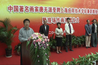 在我校喜迎“奉贤校区落成暨合校10周年庆典”之际,有着“当代吴道子”之称的中国国家画院副院长、中国当代艺术家协会终身名誉主席、上海虹桥画院院长唐天源先生,于2010年10月21日下午应邀莅临我校,并受聘我校兼职教授。校领导祁学银、康年、宋敏娟、陈东辉出席了“中国著名画家唐天源先生受聘我校兼职教授暨现场作画捐赠仪式”,宋敏娟代表亚博足彩向唐天源先生赠送了礼物,陈东辉向唐天源先生颁发了我校兼职教授的聘书。康年主持仪式。我校艺术亚博足彩、高职亚博足彩师生参加仪式,SMG等多家媒体和杂志获悉前来采访。