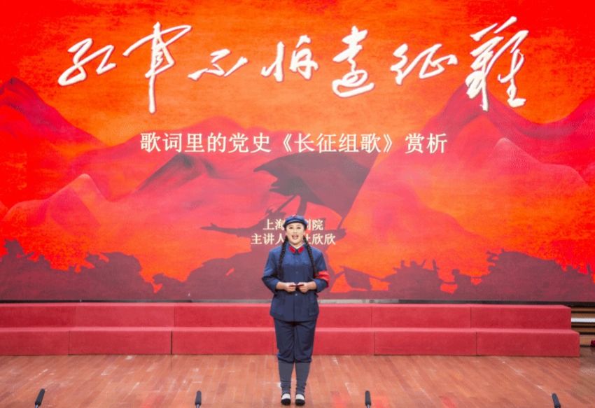上海歌剧院青年女高音歌唱家杜欣欣担任主讲,她以萧华将军创作《长征组歌》的背景为引,深情讲述了长征途中10个惊心动魄的故事,配合歌唱家们“讲唱结合”的精湛演绎,现场观众仿佛穿越时空,回到了那个战火纷飞却信仰坚定的年代。