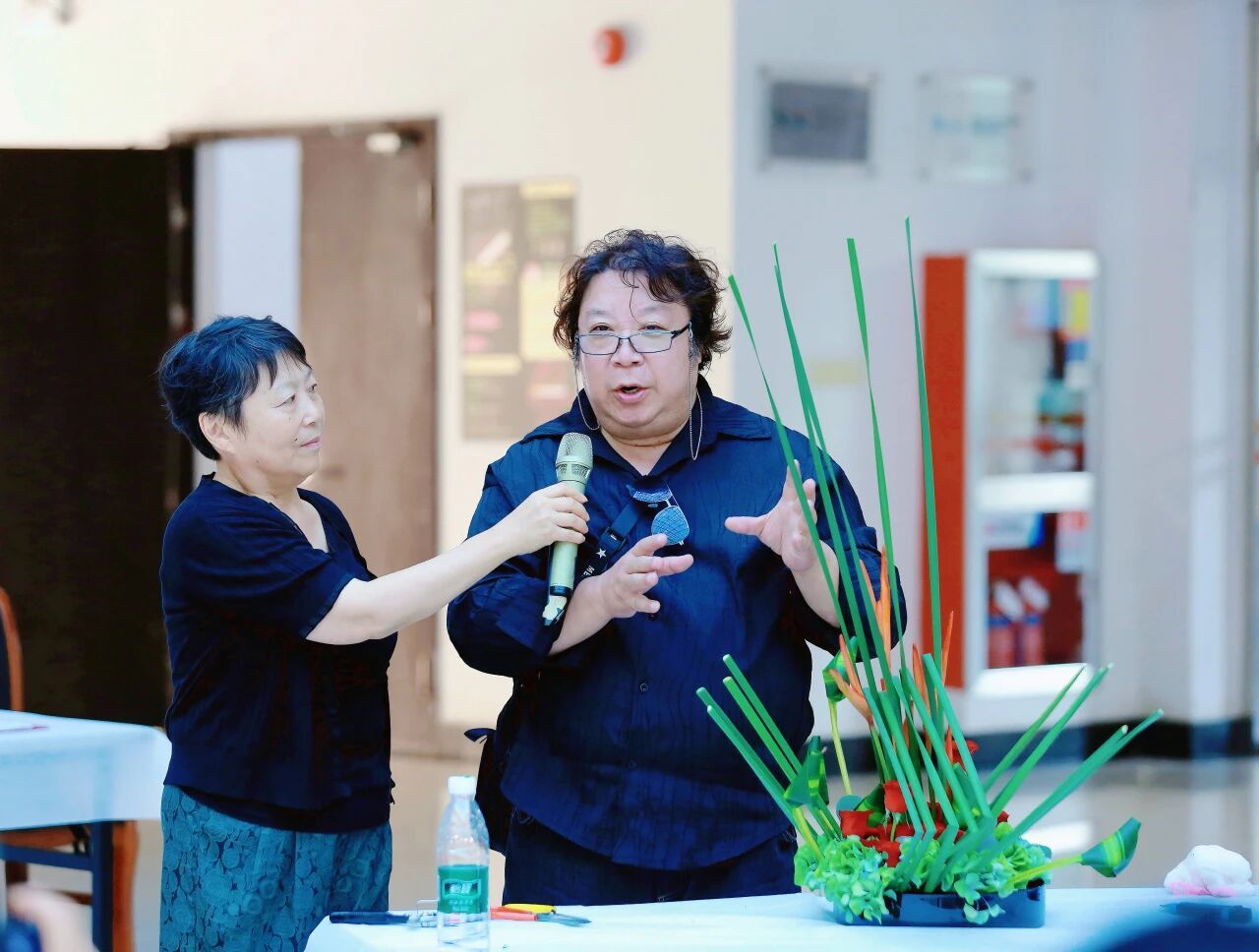 两场“大师级”花艺展示,让现场氛围再掀高潮。中国插花花艺大师、海派非遗传承人王路昌老师和中国插花花艺大师谢明老师登场,现场展示海派插花的精髓,让全场沉浸式感受“非遗之美、匠心之魂”。“插花不是堆花,要雅致又不失简洁,把中华文化的意涵藏进去。” “传承不是复制,是用你们的青春视角,让老技艺开出新花。”两位大师娓娓道来,鼓励学子融合文学、艺术与生活美学,勇于创新,传承并发扬海派花艺的开放精神与精致格调。