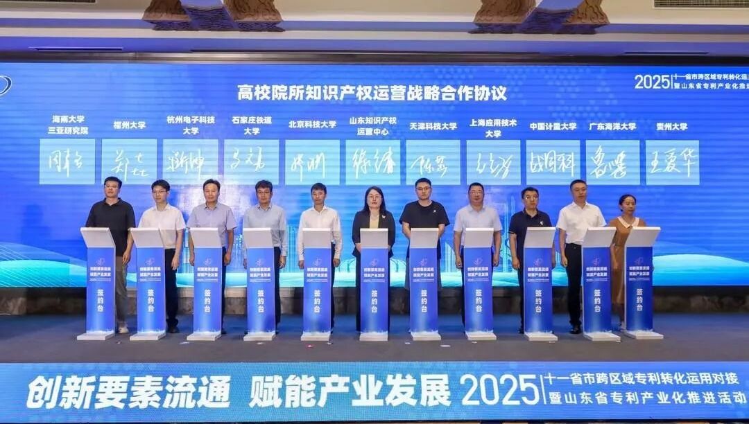 9月4日,“2025年十一省市跨区域专利转化运用对接活动”在山东济南举办。本次活动由国家知识产权局指导、山东省知识产权局主办,旨在深度链接上海、北京、江苏等十一省市创新资源,构建跨区域专利转化协同体系,加速推动创新要素高效流动和优化配置,赋能新质生产力发展。上海应用技术大学作为上海唯一特邀高校代表参会,副校长王占勇出席,科学技术研究院院长杜永陪同参会。