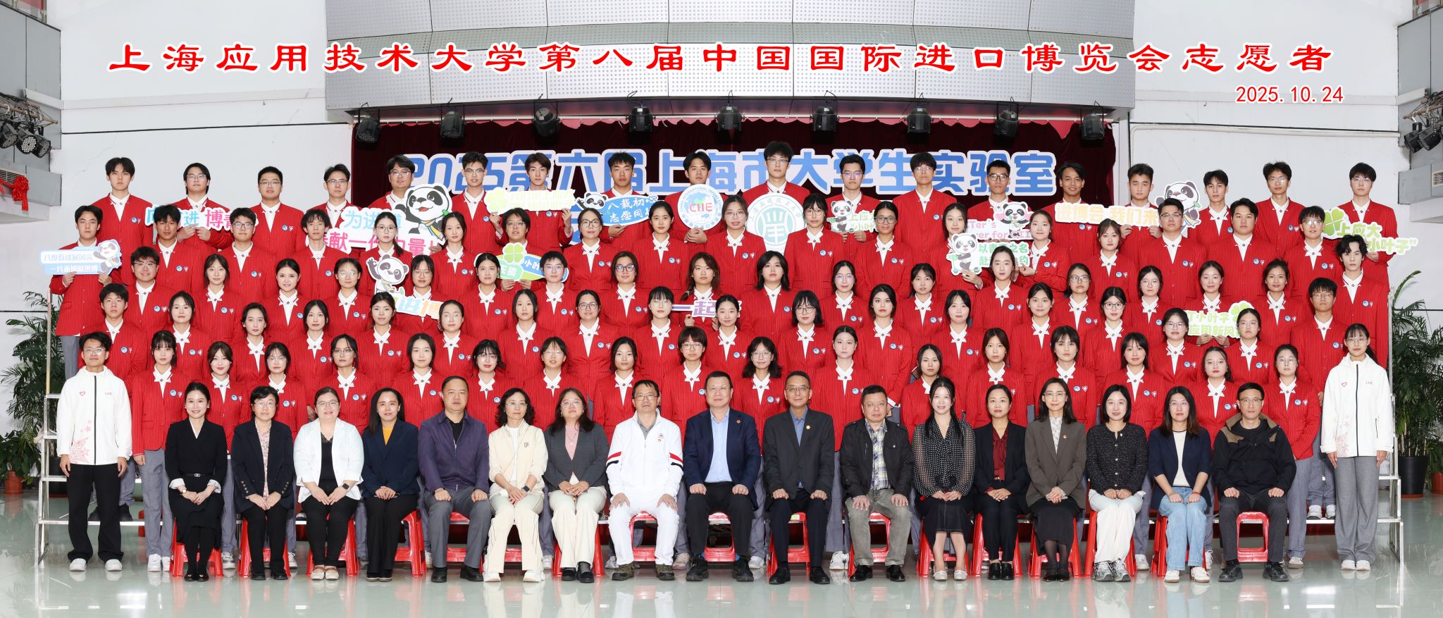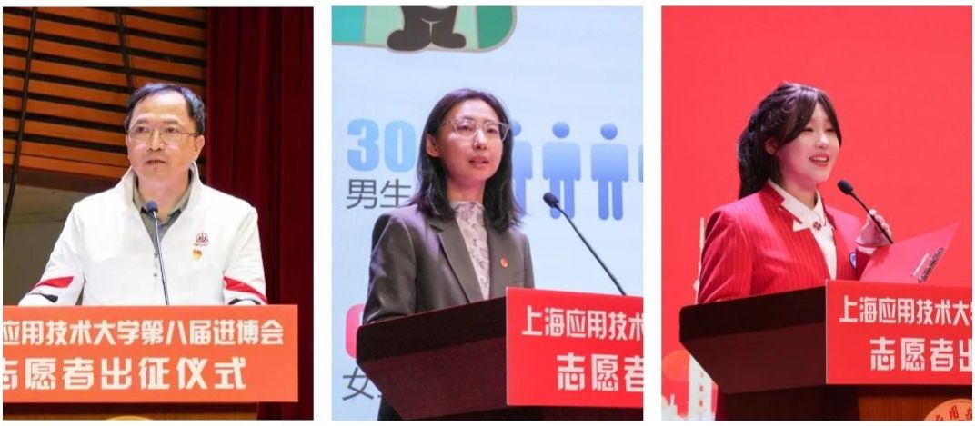 今天(10月24日)下午,上海应用技术大学第八届进博会志愿者出征仪式在奉贤校区举行。七载时光流转,上应大“小叶子”即将再度闪耀进博舞台,以青春之姿展现上应风采,以奉献之心彰显青年担当。校长汪小帆为志愿者队授旗并作动员讲话。校党委学工部部长、人民武装部部长、学生处处长袁翔主持仪式。