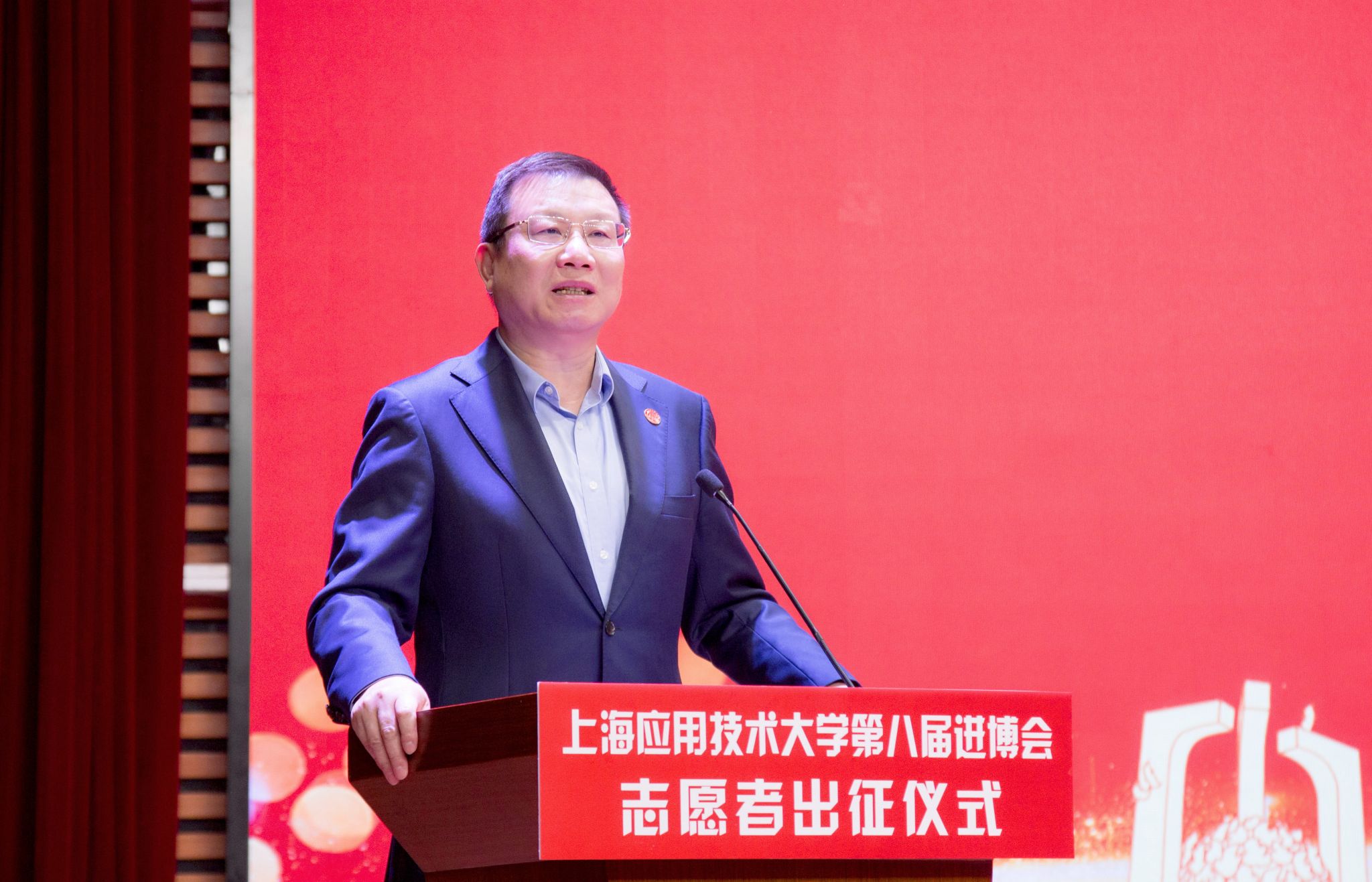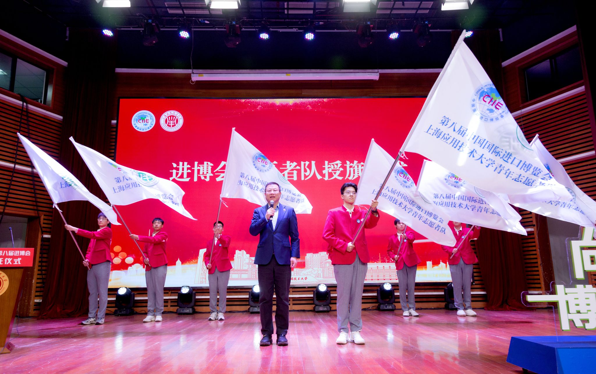 汪小帆将“上海应用技术大学第八届中国国际进口博览会志愿服务队”队旗交予志愿者代表,并宣布志愿服务正式出征。