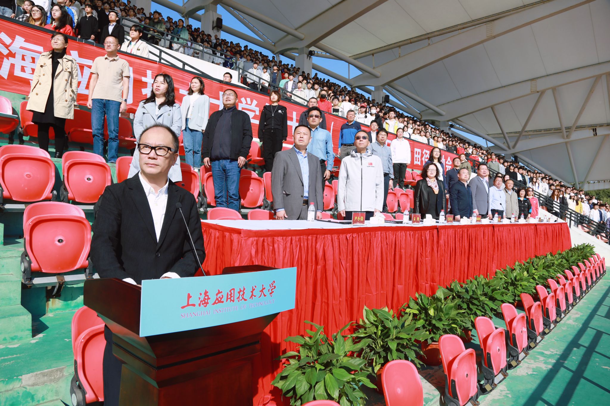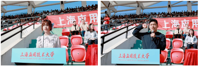 郭庆松宣布上海应用技术大学第十届田径运动会正式开幕!现场礼花绽放、掌声雷动,方队整肃、红旗猎猎。偌大的田径场,处处充盈着欢乐的气氛和澎湃的激情!