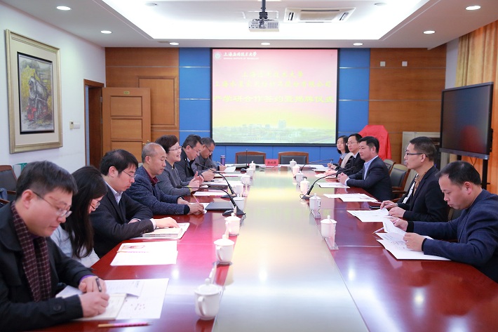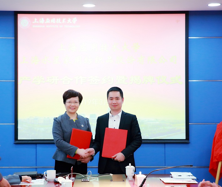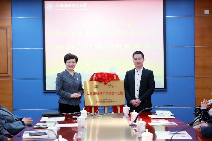 柯勤飞和李裕陆共同签订了产学研合作协议,并一同为“上海应用技术大学-上海水星家用纺织品股份有限公司芳香新材料产学研合作基地”揭牌。