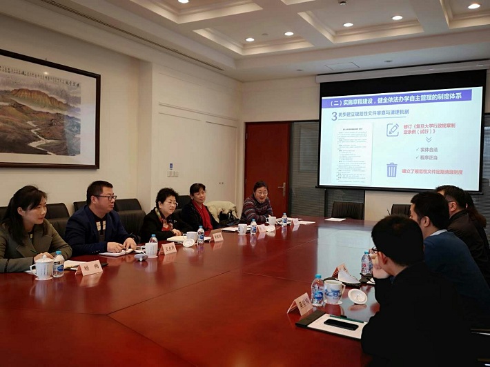 12月25日,为借鉴学习兄弟院校依法治校的建设经验和做法,校党委副书记宋敏娟带队赴复旦大学和上海财经大学调研。党办、校办、规划与政策法规研究室等相关部门负责人参加调研访谈。