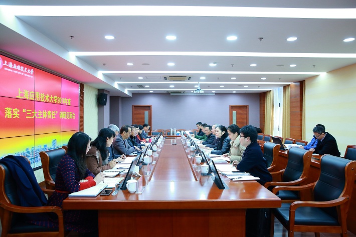 为进一步推动全面从严治党向基层延伸,促进我校党的建设各项工作全面进步、全面过硬,12月14日,由上海海事大学原党委书记於世成为组长的市教卫工作党委落实“三大主体责任”第二检查组来我校,对2018年度校党委落实“意识形态工作、基层党建工作、党风廉政建设和党内监督工作”三大主体责任情况进行实地调研检查。校党委书记刘宇陆,校党委副书记、校长柯勤飞,校党委副书记、纪委书记何星海,校党委副书记、副校长王瑛,副校长张锁怀,党委常委、宣传部长杨明及部分职能部门负责人等共同出席调研见面会。