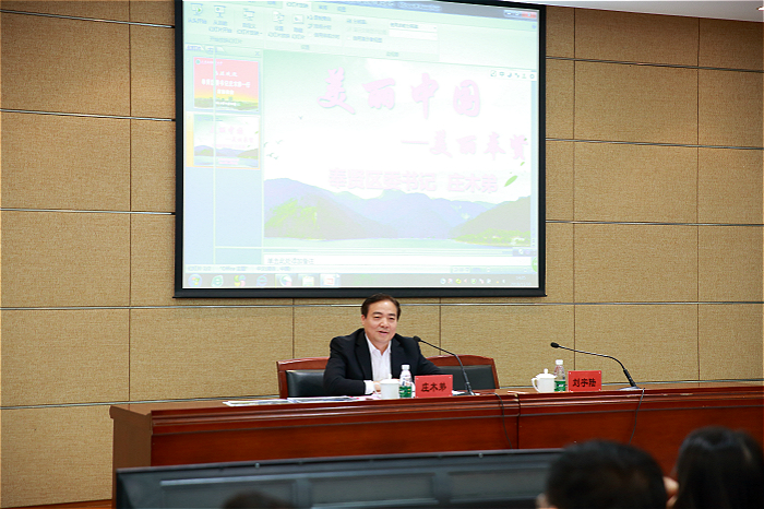 11月30日下午,奉贤校区图书馆的B101报告厅里座无虚席,党的十九大代表、中共上海市第十一届委员会委员、上海市奉贤区委书记庄木弟应邀到校讲授《美丽中国》的一堂课,为本学期我校《美丽中国》课程画上圆满句号。校党委书记刘宇陆主持,校党委副书记宋敏娟出席,亚博足彩课程思政建设相关干部教师及选修《美丽中国》课程的学生聆听讲课。