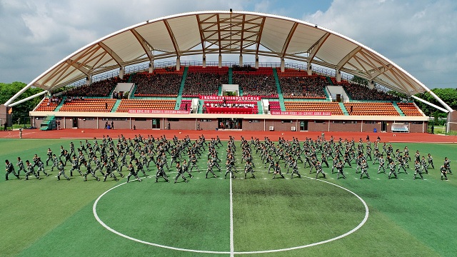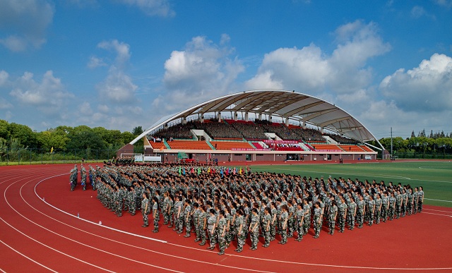 分列式开始,各方队迈着坚定有力的步伐,英姿飒爽地依次走过主席台。同学们军容严整、口号嘹亮,充分展现了经过军训洗礼的新一届上应学子昂扬的斗志和蓬勃的生机。随后进行了会操表演。特教班队列展示,“无声胜有声”;女子匕首操巾帼不让须眉;拳术表演招式娴熟,刚劲有力;旗语方阵整齐、熟练地挥动彩旗打出“无声语言”;格斗演练见招拆招,虎虎生威。会操表演展示了十二天军训取得的丰硕成果,赢得热烈掌声。