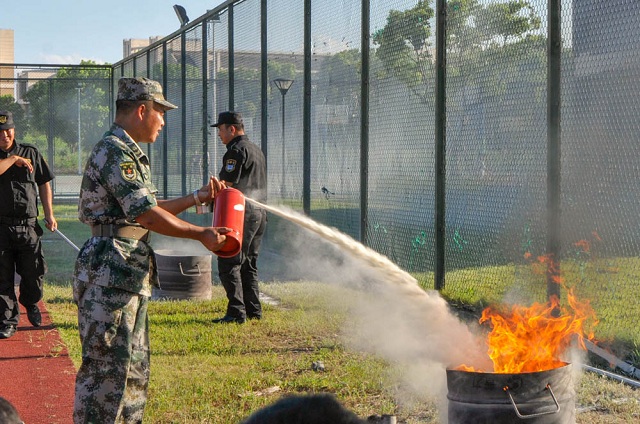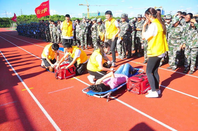 活动包括消防安全讲座、疏散逃生、遇险营救和灭火演练四个项目。先行开展的消防安全讲座为广大学生普及了消防安全知识和常识。随后的疏散逃生演练和遇险营救中,随着警笛声和滚滚浓烟,学生们紧张有序地从25号学生宿舍楼疏散,消防车搭好金属拉梯将2名被困学生从3楼安全救下,救下后由校红十字会人员现场组织包扎急救,整个疏散逃生过程严密有序,达到预期演练效果。在灭火演练环节,教官通过声情并茂的讲解和详细认真的演示教会了大家如何使用灭火器,有部分学生也手持灭火器,亲身参与其中。