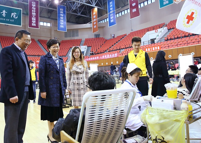 4月24日至25日,我校组织开展2018年上半年无偿献血活动。校党委书记刘宇陆,校党委副书记、校长柯勤飞,校党委副书记、副校长王瑛,副校长毛祥东先后来到献血现场,亲切慰问献血的师生,与医护人员、献血师生和志愿服务人员亲切交谈。