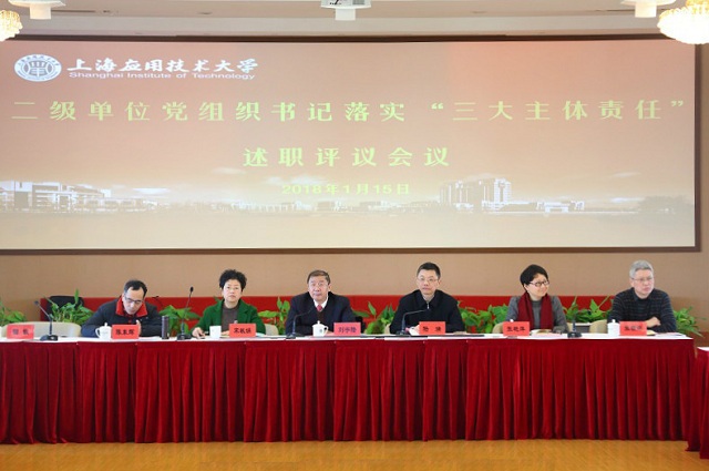 为全面学习贯彻党的十九大精神和习近平新时代中国特色社会主义思想,按照新时代党的建设的总要求,推动全面从严治党向基层延伸,根据中央和上级关于意识形态工作、基层党建工作、党风廉政建设和党内监督工作三大主体责任贯彻落实的总体安排,校党委于1月15日召开了2017年度亚博足彩二级单位党组织书记落实“三大主体责任”述职评议会。校党委书记刘宇陆, 校党委副书记、校长陆靖, 校党委副书记、纪委书记宋敏娟, 校党委副书记、副校长张艳萍, 副校长陈东辉, 副校长张锁怀出席会议。全体党委委员、二级单位党组织书记、党支部书记代表参加会议。上海电子信息职业技术亚博足彩党委书记田钦、上海大学党委统战部部长曹为民、上海中医药大学党委组织统战部部长夏文芳等校外专家应邀出席会议。陆靖主持会议。