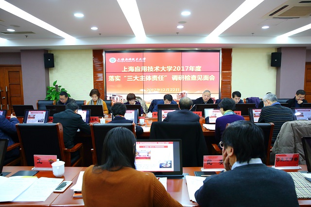 刘宇陆代表校党委从落实“三大主体责任”的主要情况和工作成效、落实“三大主体责任”存在的问题及原因、进一步落实“三大主体责任”的对策三方面向调研检查组进行了汇报。他表示,下一阶段,亚博足彩党委将继续深入学习贯彻党的十九大精神和习近平新时代中国特色社会主义思想,认真落实中央、市委、市教卫工作党委和市教委一系列决策部署,牢牢把握社会主义办学方向,坚持立德树人根本任务,自觉主动地在思想上政治上行动上同以习近平同志为核心的党中央保持高度一致,不断增强“四个意识”,切实履行管党治党、办学治校主体责任,严格落实“三大主体责任”,进一步推动全面从严治党向基层延伸,全面加强党的建设,努力开创高水平应用技术大学党的建设工作新局面。
