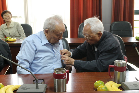 会上还向老干部们发放了上海应用技术大学的新校徽,老干部们纷纷将校徽别在了胸口并留影纪念。