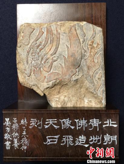 图为西泠印社理事唐存才收藏的来自山东青州的佛造像装饰底本飞天石刻。 许婧 摄
