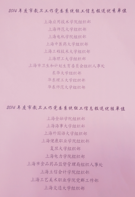 近日,上海市教卫工作党委对2014年组工信息报送情况进行了评比表彰,共评出优秀单位10家,优胜单位10家,我校在10家优秀单位中名列第一。