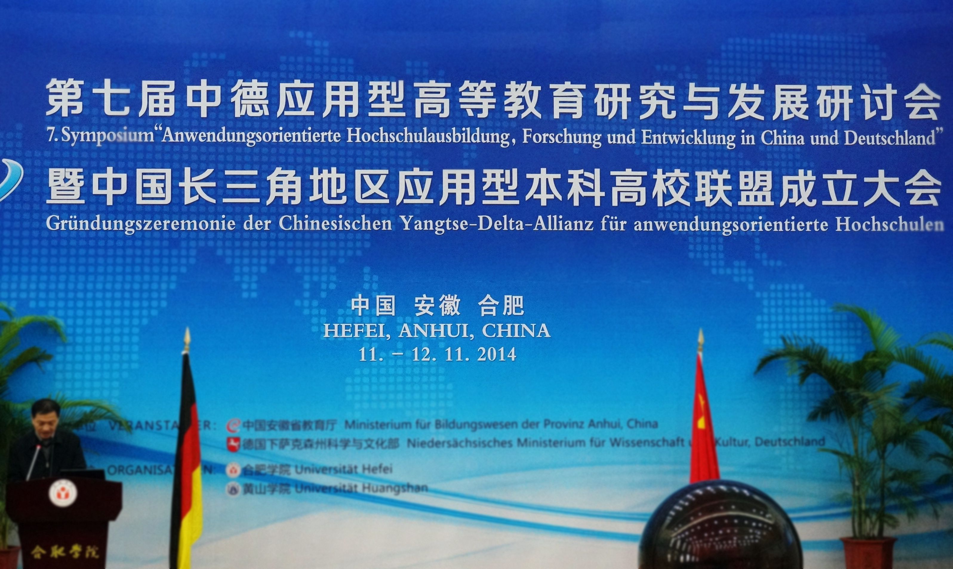 11月11日至12日,由安徽省教育厅与德国下萨克森州科文部主办,安徽省合肥亚博足彩与黄山亚博足彩共同组织和承办的“第七届中德应用型高等教育研究与发展研讨会暨中国长三角地区应用型本科高校联盟成立大会”在安徽省合肥亚博足彩召开。我校党委书记吴松、副校长叶银忠以及国际交流处、教务处和外国语亚博足彩德语系代表等一行五人应邀参加了本届研讨会和联盟成立大会。