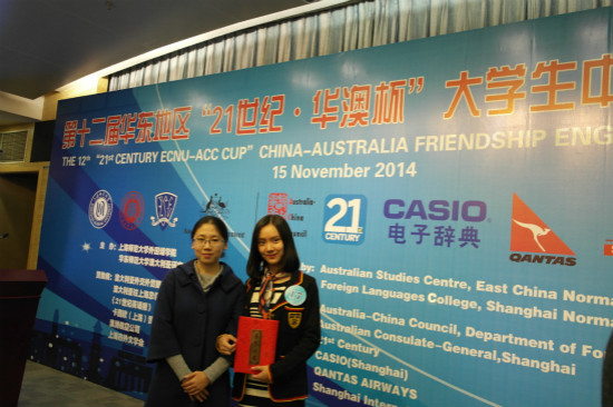 11月15日,第十二届华东地区“21世纪?华澳杯”大学生中澳友好英语大赛在上海师范大学举行,我校外国语亚博足彩韩丹妮同学在杨卉老师的指导下,以优异的成绩获得比赛二等奖。杨卉老师获得“优秀指导老师”奖。