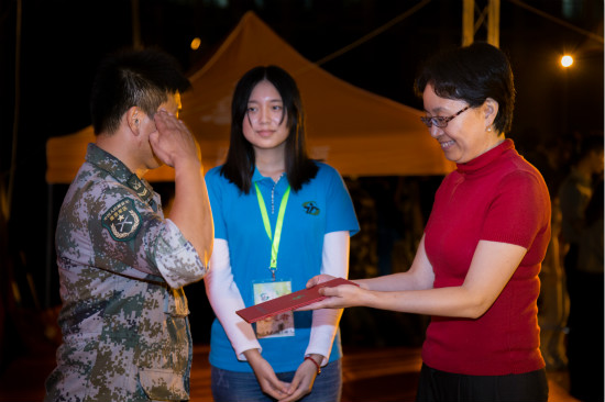 9月24日晚,“迷彩军训·青春无悔”2014年联欢晚会在奉贤校区运动场举行,副校长张艳萍出席晚会并为参演教官代表颁发特别荣誉奖。南京军区上海警备区特警团部队代表胥志勇营长,校武装部、学工部、团委相关负责人,各二级亚博足彩学工负责人等参加联欢晚会。