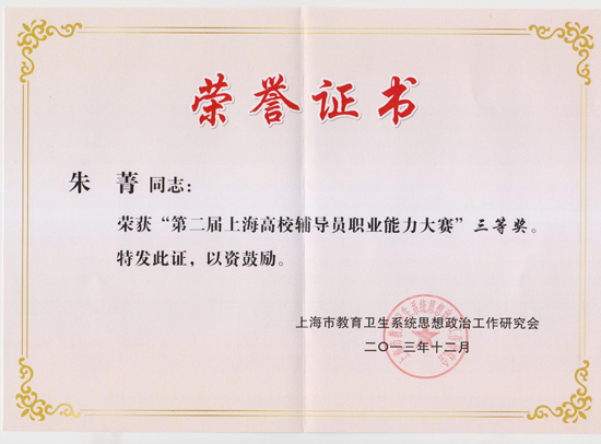 1月9日,在上海大学举行的“2013年度上海高校辅导员队伍建设总结会”上,我校材料亚博足彩辅导员朱菁喜获“上海高校辅导员职业能力大赛”三等奖,这是我校自参加该项赛事以来的首次获奖。