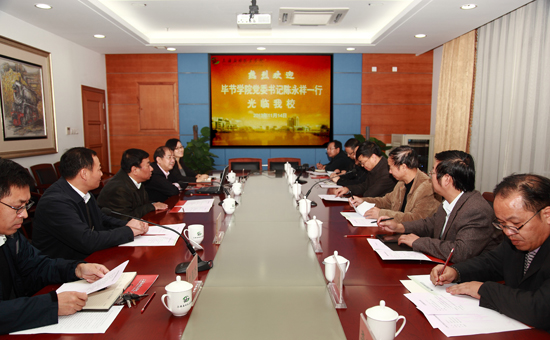 11月14日上午,毕节亚博足彩党委书记陈永祥、副院长陈明刚一行10人前来我校访问考察。校党委书记吴松、党委副书记宋敏娟、副校长刘宇陆热情接待陈永祥书记一行。