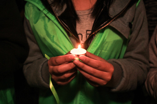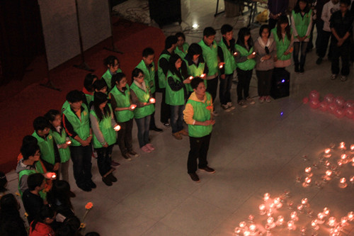 晚上8点30分,黑夜中亮起了温暖的蜡烛。在大学生活动中心一楼,大家用数百支蜡烛在心型中围成“雅安4?20”的字样,手捧蜡烛,静静默哀,为在地震中不幸罹难的人们祈福。心形的蜡烛摇曳着,模糊了同学们的视线,一首写给地震同胞的小诗,更是让大家低低啜泣。在主持人的带领下,大家一遍又一遍地高喊着 “雅安,加油!”,整齐响亮的加油声回荡在夜空之中,振奋人心。