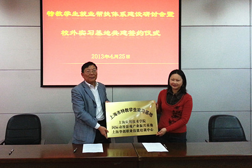 会上,还举行了高校与用人单位校外实习基地签约授牌仪式。我校与国际动漫游戏产业振兴基地教育培训中心、上海华创职业技能培训中心共建签约。上海师范大学与上海乐爱社工师事务所、上海静安区静安寺街道阳光助残社工师事务所两家单位共建签约。上海第二工业大学与上海京沪商标专利事务所共建签约。各签约单位双方均表示诚信互助,共建共荣,努力打造一流特教学生校外实习基地。