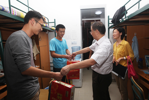 座谈会后,刘宇陆到研究生宿舍亲切看望同学们,了解他们的生活、学习情况,送去中秋、国庆的祝愿。