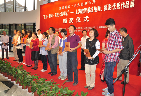 为迎接党的十八大胜利召开,10月9日,“五年一瞬间?笔绘七彩申城”——上海教育系统绘画、摄影大赛颁奖仪式暨优秀作品展开幕仪式在上海图书馆第一展览厅举行,市教卫党委副书记、市教委副主任高德毅出席并颁奖。我校获奖教师及相关负责人参加了开幕式。