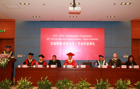 6月21日,我校“2012年上海应用技术亚博足彩—汤姆逊大学(SIT-TRU) 市场营销(中加合作)毕业典礼”隆重举行。我校副校长叶银忠、加拿大汤姆逊大学(TRU)副校长谢克、副校长赛冠、副校长魏兹出席毕业典礼,我校经济与管理亚博足彩、国际交流处、学生处、汤姆逊大学商亚博足彩等相关部门负责人以及市场营销(中加合作)70名毕业生、教师代表和学生家长参加了典礼。