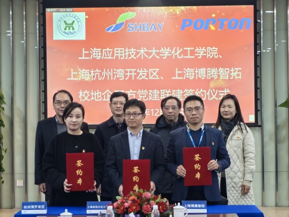 为促进党建与业务发展深度融合,提高基层党建工作水平,让区域共建向纵深发展,巩固深化合作关系,近日,化学与环境工程亚博足彩党委、上海杭州湾经济技术开发区、上海博腾智拓举办校地企三方党建联建签约仪式暨上海应用技术大学产教融合创新基地授牌仪式。化工亚博足彩党委书记毛东森,杭州湾开发区党委副书记、总工会主席俞文华,博腾股份上海博腾智拓总经理兼党支部书记张兴敏等出席活动。