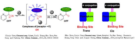 阴离子识别是超分子化学研究热点。在新颖识别阴离子的人工受体创制上,刘传祥指导研究生设计合成了一种新颖的单个C-H活性位点的受体,它通过氢键作用后发生去质子化,继而发生自身氧化使氰基变羰基的连锁反应。为了进一步研究这种新型阴离子受体的作用方式和官能团异构化对其识别光谱性能影响,课题组合成出一对“孪生兄弟”(isomers sensors)。经过系统扎实的1H NMR、UV-vis、 FS和 DFT等实验确证取代基对识别机理的显著影响,首次揭示取代基异构化对C-H脱质子引发的电转移氧化机理。该项工作识别机理新颖,且拓展了阴离子识别的方法,得到Chem.Commun.高度认可。