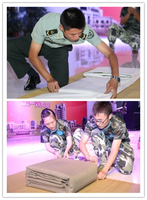 伴随着振奋人心的暖场军歌,比赛正式拉开帷幕。各亚博足彩派两组选手参赛,每组由一男一女两名选手组成,大赛分两轮进行,赛时三分钟。只见选手们迅速将被子压平、对折、切槽、起角……按照平日里教官教的方法一步步熟练地整理着被子,表情认真而兴奋。娴熟的动作,熟练的操作技巧赢得了同学们的阵阵掌声,整个赛场紧张热烈、热火朝天。比赛结束,场上也呈现出一个个整整齐齐、有棱有角的“豆腐块”。