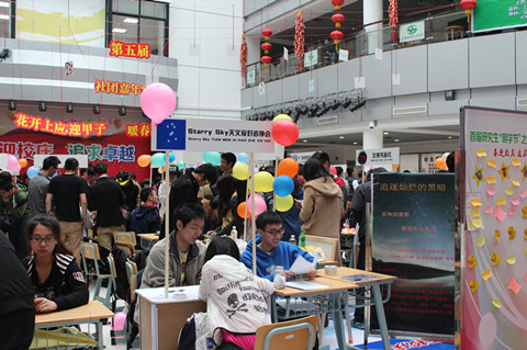 4月26日下午,校庆系列活动之“花开上应迎甲子,暖春社团庆华诞”第五届社团嘉年华于学生活动中心大厅正式开幕。本次嘉年华活动有32个社团参加,各社团的位置被精心组合成“60”的图案。