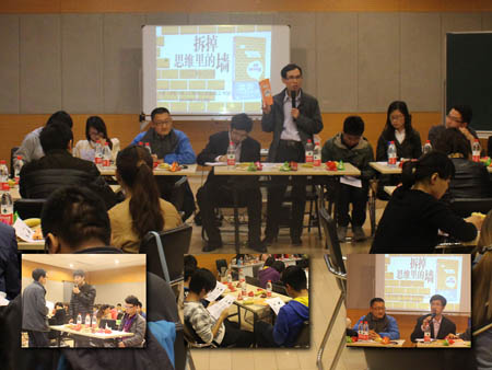 庄明科老师以“解决问题的思维模式”为例,带领学生们体验了在职业咨询师引导下打破思维之墙的过程,让学生们对职业咨询有了一个从书本理论到实践操作的具象认知;张化老师通过几个发生在身边的真实故事,提醒大家路径依赖的顽固性不容小觑,很多“聪明人”就是因为对“墙外的恐惧”而无法迈出破墙而出的那一步;李资娟老师以自己人生体验向大家阐明了执行力在人生中的重要性,鼓励大家勇于实践、大胆改变;傅晓龙老师进一步为大家分析了书中职业生涯的三种心智模型,帮助大家根据自己的人生目标找准职业定位;欧阳丹丹老师从心理学的角度出发,补充阐释了改变心智模式的心理学依据——心理暗示现象。最后,学生们就阅读与听讲中的疑问与各位嘉宾老师进行了热烈的交流。