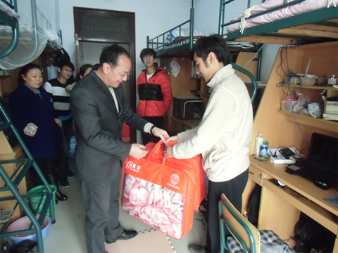 12月6下午,电气亚博足彩党总支书记徐兵、副书记胡婷和亚博足彩辅导员走访了学生宿舍,慰问亚博足彩2013级困难学生,并送上了毛毯、床垫、保暖内衣等御寒慰问品,让学生在严冬里感受了亚博足彩和亚博足彩送出的阵阵暖意。