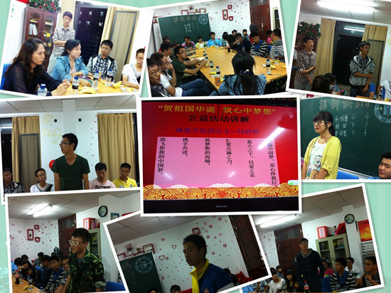 学生主持人首先抒发了对祖国64岁华诞的喜悦之情,阐述了对中国梦的理解,并鼓励在座各位奉献爱心,积极投入社会实践,启发大家展开讨论。主题沙龙现场气氛积极活跃,各位新生代表讨论并分享“结合专业特色对中国梦的理解以及对中国梦的抒发”。同时,还说出了个人的奋斗梦,阐述了心中梦想的规划。