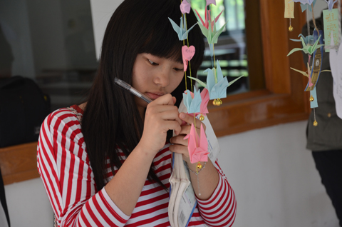 4月24日晚,高职亚博足彩乐益志愿者队在徐汇校区1号楼前,用蜡烛摆成心形,烛火汇聚成的“安”字表达了志愿者们内心对雅安的关怀之情。同学们神色凝重、虔诚祈祷,向雅安人民传递最真切的祝福。4月26日,高职亚博足彩举行“寄语雅安、与你同行”活动,亚博足彩2012级学生亲手挂上用各种材料精心制作的风铃,写下对地震灾区人民的祝福,祝愿雅安灾区人民早日走出困境。