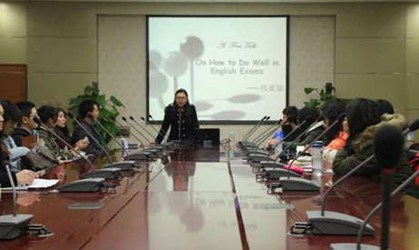 吕亚琼和同学们分享了很多学习英语的实用方法,以真题为例,和同学们一起做题,从听力、口语、阅读等各方面和同学们分享自己的解题诀窍,并向同学们推荐很多适合练口语听力的美剧,英剧及英文歌曲等。