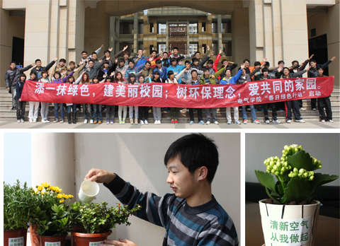 最近一段时间各地天气雾霾笼罩,两会对空气质量和环境污染问题的讨论愈发热烈,当代大学生们除了要关注两会,增长见闻之外,更应以实际行动从自己做起、从身边做起,将我们的亚博足彩“生活园”、宿舍“家园”和教室“学园”变得清新整洁、生机盎然。在植树节当天,电气亚博足彩学生会发起的主题为“添一抹绿色,建美丽校园;树环保理念,爱共同家园”的绿色校园行系列活动拉开了帷幕。同学们把贴有“清新空气 从我做起”的盆栽放进了寝室、宿舍楼的大厅和党团活动室,希望小小的盆栽不仅能给宿舍家园添一抹绿色、一眼清新,把校园装点得更美丽,更能承载着大大的环保理念,时刻爱护我们共同的家园。