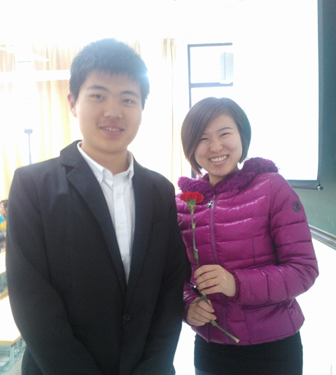 在班导师徐琴琴的课上,同学们偷偷布置好教室,“埋伏”在老师经过的路口,给她送上一朵康乃馨,回到教室,同学们又为老师献上了配乐诗朗诵,激动和喜悦洋溢在每个人脸上。12级德语2班来到辅导员孟乾老师的办公室,送上了鲜花、礼物及发自内心的祝福。11级英语2班的同学们提早到教室做好准备,班长为班导师林晓君送上一盒茉莉花茶和一卷润喉糖,同学们还准备了一首改编歌曲“有一个美丽的女老师,她的名字叫做晓君”献给老师。一曲唱毕,同学们喊出了自己的心声:“老师,我们专四一定会努力的”, 林晓君激动地表示这是她收到的最好的节日礼物。