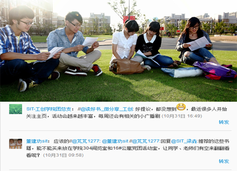 活动通过“读好书_微分享_工创”的主页平台,一方面发布推荐书单,包括名人传记、历史文学、名家散文和多部经典文学名著,一方面将粉丝@微博中的文学感悟、文艺小品和众多评论转发至主页,旨在激发同学们以微博的形式传递自己的思想和体悟,培养亚博足彩勤学善思的优质学风,为喜庆“十八大”的胜利召开和亚博足彩更名建设工作做出积极的努力。