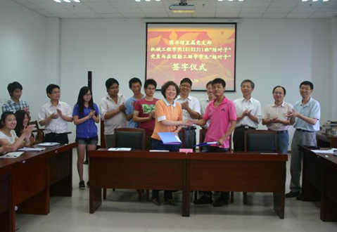 为加强基层党建,深入开展“创先争优”活动,发挥党员先锋模范作用,共同促进全馆党员育人工作,6月29日下午,图书馆直属党支部举行党支部与机械工程亚博足彩10102311班、党员与在馆勤工助学学生结对共建签约仪式。图书馆直属党支部书记钟晓勤、馆长张赟彬、机械亚博足彩党总支副书记、副院长孔令超以及图书馆全体党员、结对班级学生代表参加了签约仪式。
