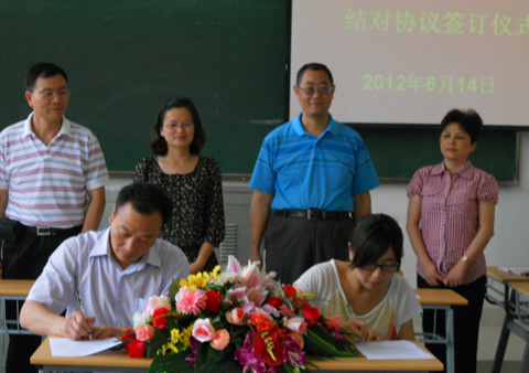 为充分发挥党员先锋模范作用,共同促进全员育人工作,建立师生相互交流沟通平台,6月14日下午,机关党总支、机关第五党支部分别与外国语亚博足彩英语专业11111111班、德语专业11111211班举行结对签约仪式。党办主任、机关第五党支部书记杨明和机关党总支副书记朱柳娟与结对班级学生代表签订了结对协议。外国语亚博足彩党总支副书记、副院长赵慧参加签约仪式并致辞。