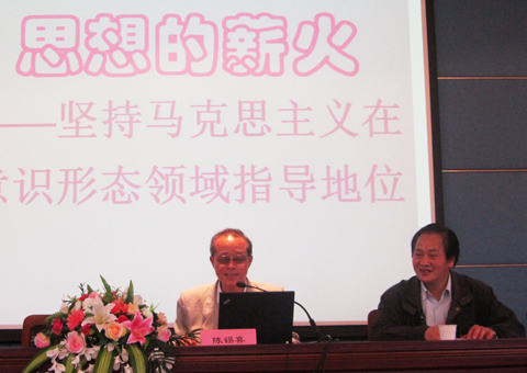 陈锡喜教授的报告围绕马克思主义的当代价值、时代精神的精华和传承马克思主义思想薪火三个问题展开,他指出,以发展的马克思主义整合“国学”和“西学”的积极元素,有助于提高国家文化“软实力”,增强中国在世界上的话语权;马克思主义是当代中国社会前进的“方向盘”,文化繁荣的“推进机”以及社会转型的“稳定仪”;传承马克思主义思想薪火,必须要做到“ 运用”而不是“引用”。