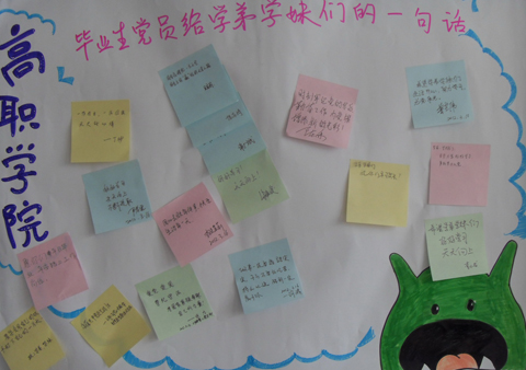 “一个党员一面旗帜,发扬高职党员优良传统”、“学会感恩,你会快乐一生;善于给予,你永远不会贫穷”、“党是一个温暖的大家庭,希望你们早日入党,为党旗增添光彩”、“希望你们抓紧每一分每一秒,珍惜学习的机会,度过充实而精彩的大学生活”、“青春没有什么不可能,只要你敢做,只要你敢闯,一切皆有可能”、“自信面对挑战,低调面对成功,学会学习,学会做人”……一句句真切的期盼暖暖地融进学弟学妹们的心坎里。