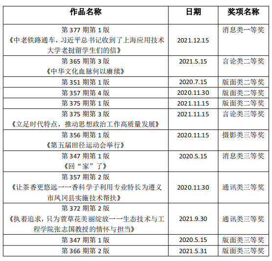 获得一等奖的作品是由轨道交通亚博足彩党总支书记李文举撰写的消息类稿件《中老铁路通车,习近平总书记收到了上海应用技术大学老挝留学生们的信》,其他奖项分别是版面类5项、言论类2项、摄影类1项、通讯类2项和消息类1项,涵盖了每个参评类别。
