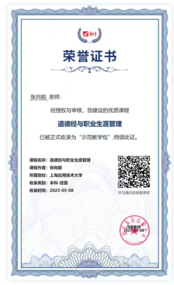 近日,人文亚博足彩院长张向前团队制作的课程《道德经与职业生涯管理》,以授课内容丰富、制作水平精良、教学效果突出等优势,经超星公司专家评审,被评为优质课程并收录为“示范教学包”。该课程此前还被智慧树平台评为第二届“智慧树杯”课程思政示范案例教学大赛全国二等奖,此次“示范教学包”的入选,对于进一步深化思政课改革创新、树立亚博足彩课程思政品牌、打造优质课程发挥积极引领与促进作用。