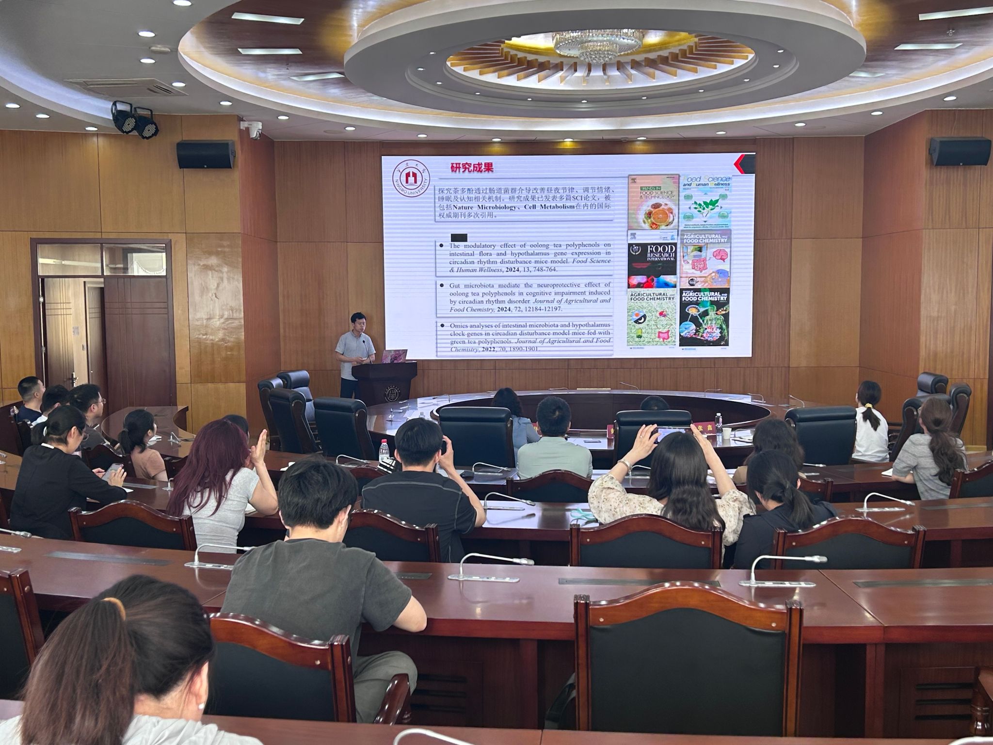 张鑫为师生带来题为《乌龙茶多酚通过肠道菌群介导发挥神经保护作用机制研究》的学术报告,系统阐释了昼夜节律紊乱与认知功能衰退的关联性,并重点分享了其团队的最新研究成果:乌龙茶特有的多酚成分(如EGCG3’Me)可通过重塑肠道菌群结构,促进短链脂肪酸生成,进而抑制神经炎症、增强突触可塑性,最终改善认知功能。研究结合16S rDNA测序、行为学实验及分子生物学技术,为神经退行性疾病的食源性干预提供了科学依据。