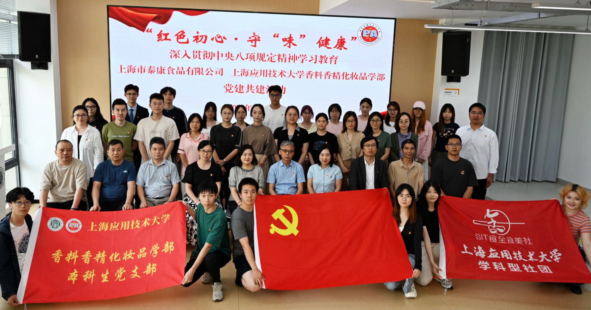 为迎接中国共产党104周年诞辰,进一步强化党员的理想信念和责任担当,探索校企协同育人新模式,6月20日,香料香精化妆品学部党委与上海市泰康食品有限公司党总支联合开展“红色初心·守‘味’健康”党建共建活动。泰康食品党总支副书记、总经理沈民,党总支副书记、工会主席郑峥业,香化学部党委副书记、副主任何静,副主任周一鸣出席活动,香化学部党员师生代表参加活动。